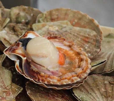 Vieira gallega fresca de tamaño mediano (11 a 12,4 cm) procedente de la Ría de Arousa.